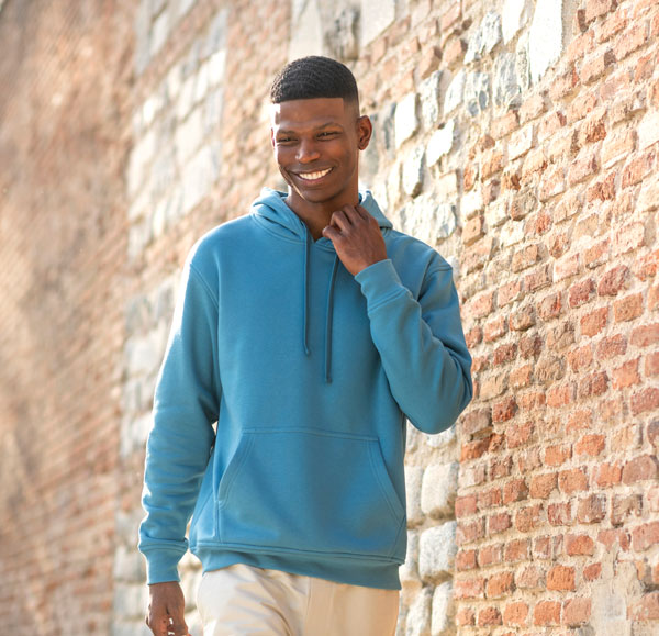 Model posiada kaptur ze sznurkami w kolorze bluzy, który chroni przed wiatrem i chłodem, oraz naszytą kieszeń typu kangur, idealną do ogrzania rąk lub przechowywania drobiazgów. Elastyczne ściągacze 2x1 przy rękawach i u dołu bluzy zapewniają idealne dopasowanie, a łatwo usuwalna metka ułatwia personalizację — bluza świetnie sprawdzi się jako element odzieży firmowej lub reklamowej.