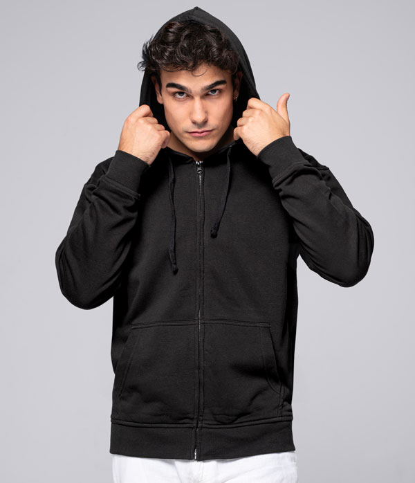 Model posiada kaptur ze sznurkami w kolorze bluzy oraz kryty zamek na całej długości, co ułatwia zakładanie i chroni przed wiatrem. Naszyta kieszeń typu kangur jest praktyczna i wygodna, idealna do przechowywania drobiazgów lub ogrzania dłoni. Elastyczne ściągacze 2x1 przy rękawach i u dołu bluzy gwarantują idealne dopasowanie, a łatwo usuwalna metka umożliwia personalizację — bluza świetnie sprawdzi się jako odzież firmowa lub reklamowa.