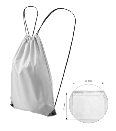 ściągacz do regulacji, 2 sznurki poliestrowe w kolorze 01, elementy odblaskowe w dolnych rogach, wewnętrzna kieszeń na zamek 20 x 23 cm, rozmiar plecaka 45 x 34 cm