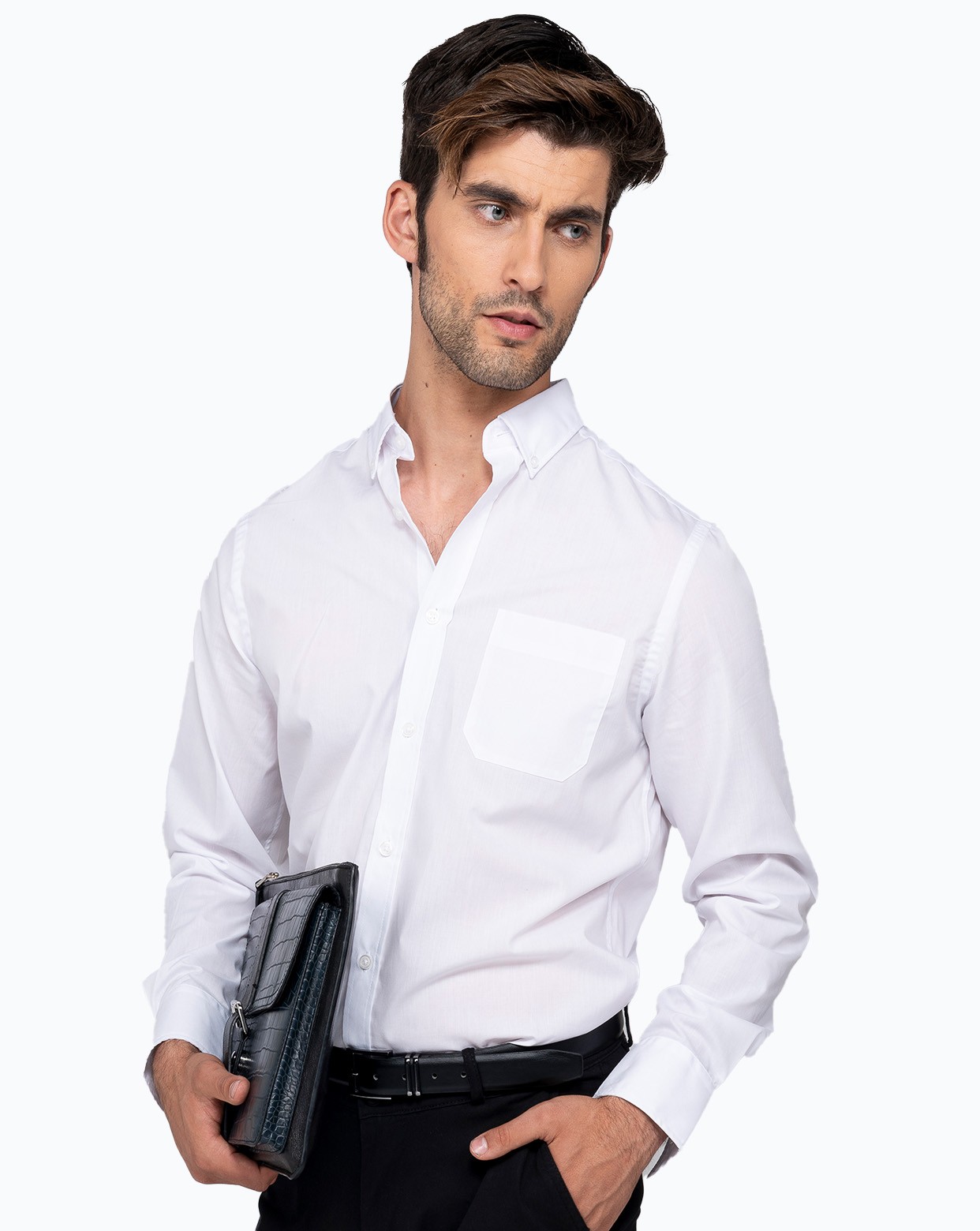 Koszula posiada kołnierzyk przypinany guzikami, który zachowuje swój kształt przez cały dzień, oraz kieszonkę na piersi – praktyczny detal, który dodaje elegancji i funkcjonalności. Guziki w kolorze koszuli tworzą spójną, schludną całość, dzięki czemu model świetnie sprawdza się zarówno w biurze, jak i w stylizacjach casualowych.