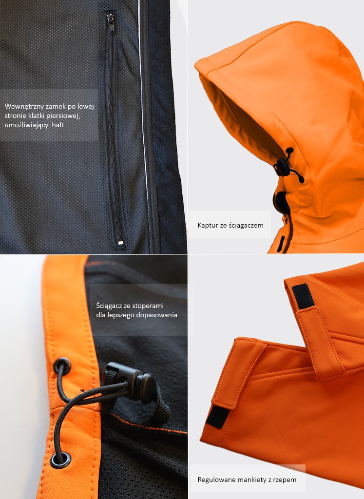 Nowoczesna i funkcjonalna kurtka typu softshell stworzona z myślą o komforcie i ochronie. Wykonana z trójwarstwowego materiału (94% poliester / 6% elastan) o gramaturze 340 g/m², łączy doskonałą wodoodporność (8000 mm) z oddychalnością (1000 g/m²/24 h), dzięki czemu zapewnia skuteczną ochronę przed deszczem i wiatrem, zachowując komfort użytkowania.